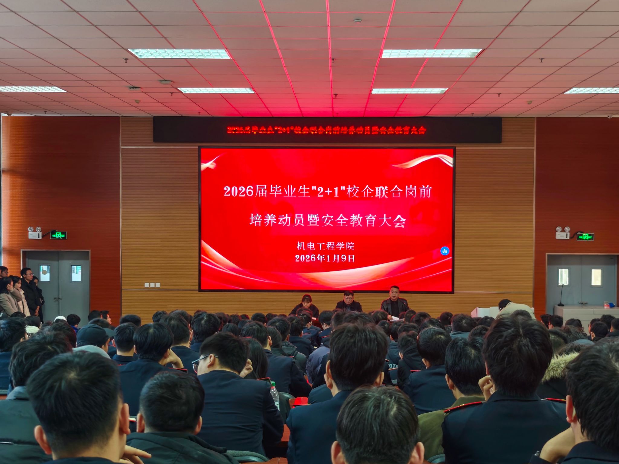 为深入推进产教融合,强化学生职业技能与综合素质,夯实校企协同育人机制,为铁路行业培养更多高素质技术技能人才。1月9日下午,机电工程学院在阶梯教室隆重举行2026届毕业生“2+1”校企联合岗前培养动员暨安全教育大会。机电工程学院党总支书记宋永兴、院长郭峰、副院长王旭波及全体辅导员、班主任、2026届“2+1”校企联合培养培训班全体学员参加大会。会议由张颖主持。