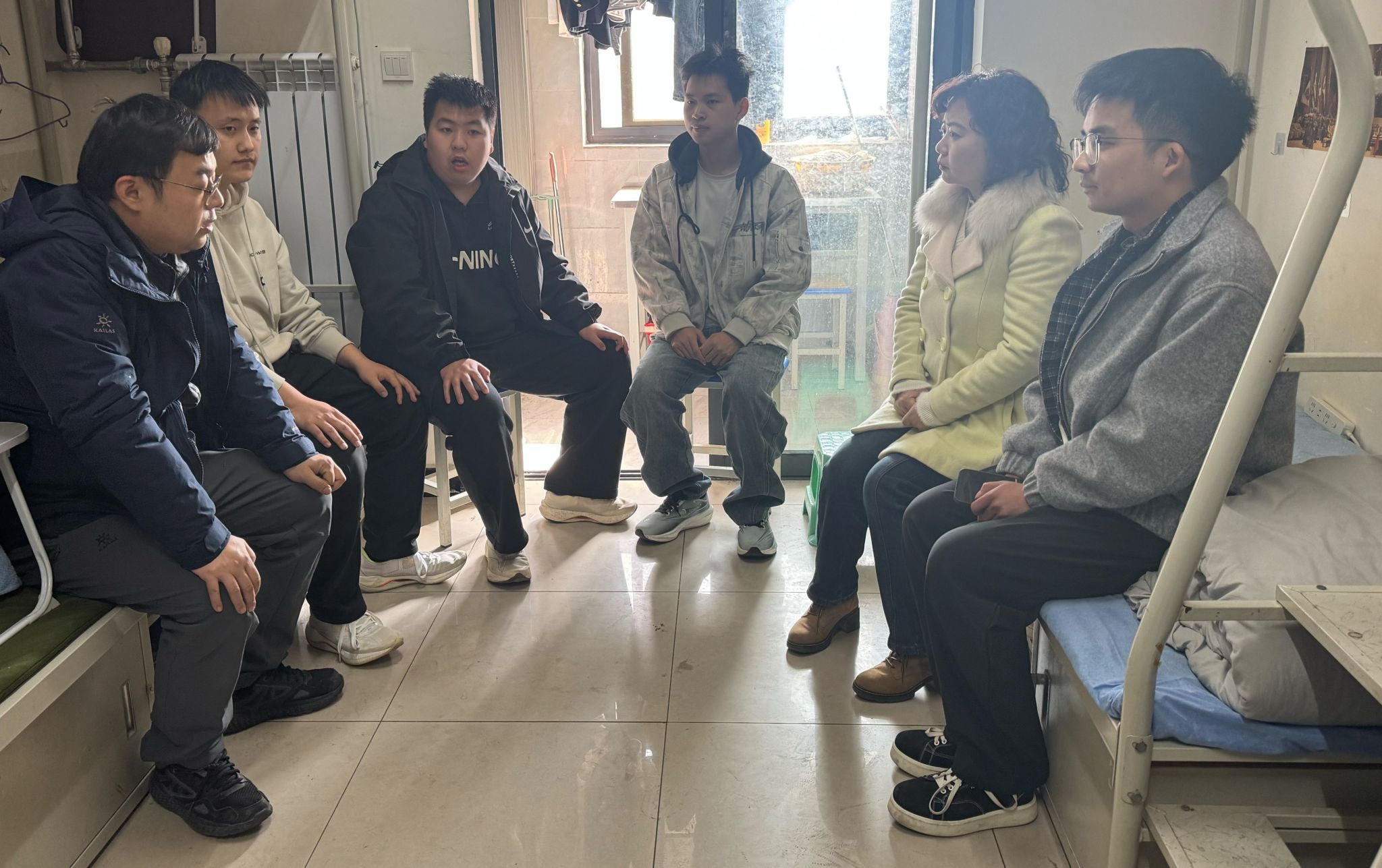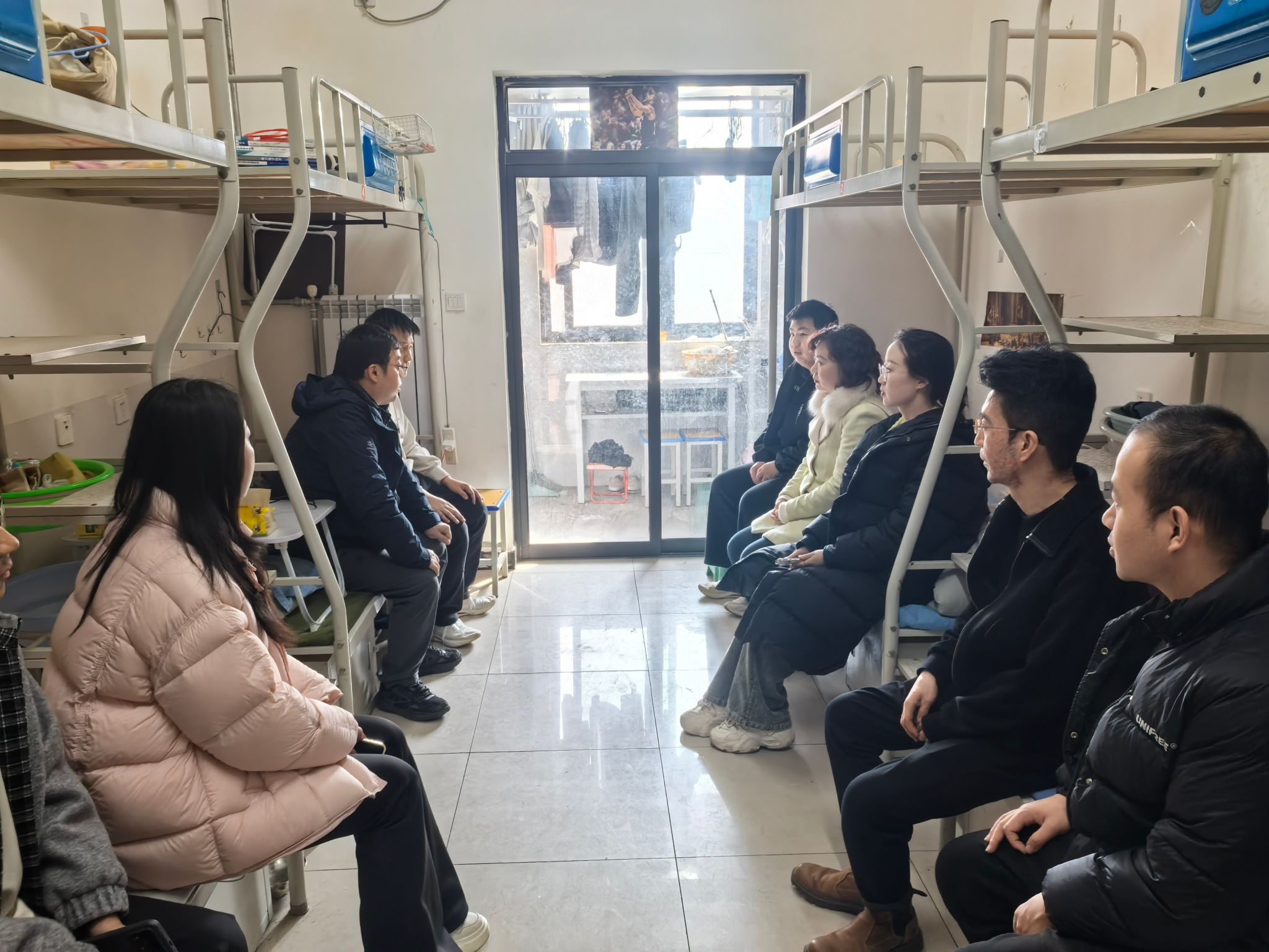 教学秩序检查结束后,宋永兴、韩臻带领辅导员深入学生宿舍,分组开展安全排查。聚焦用电安全、消防设施、环境卫生等重点,逐间查看,建立"安全隐患动态清零"台账,在毕业班宿舍,韩臻与毕业生亲切座谈,向毕业生提醒宿舍安全用电和求职安全,谨防电信诈骗,求职期间要做到"五注意"(警惕高薪陷阱、核实单位资质、保护个人信息、留存协议证据、及时求助师长谨防电信诈骗)。