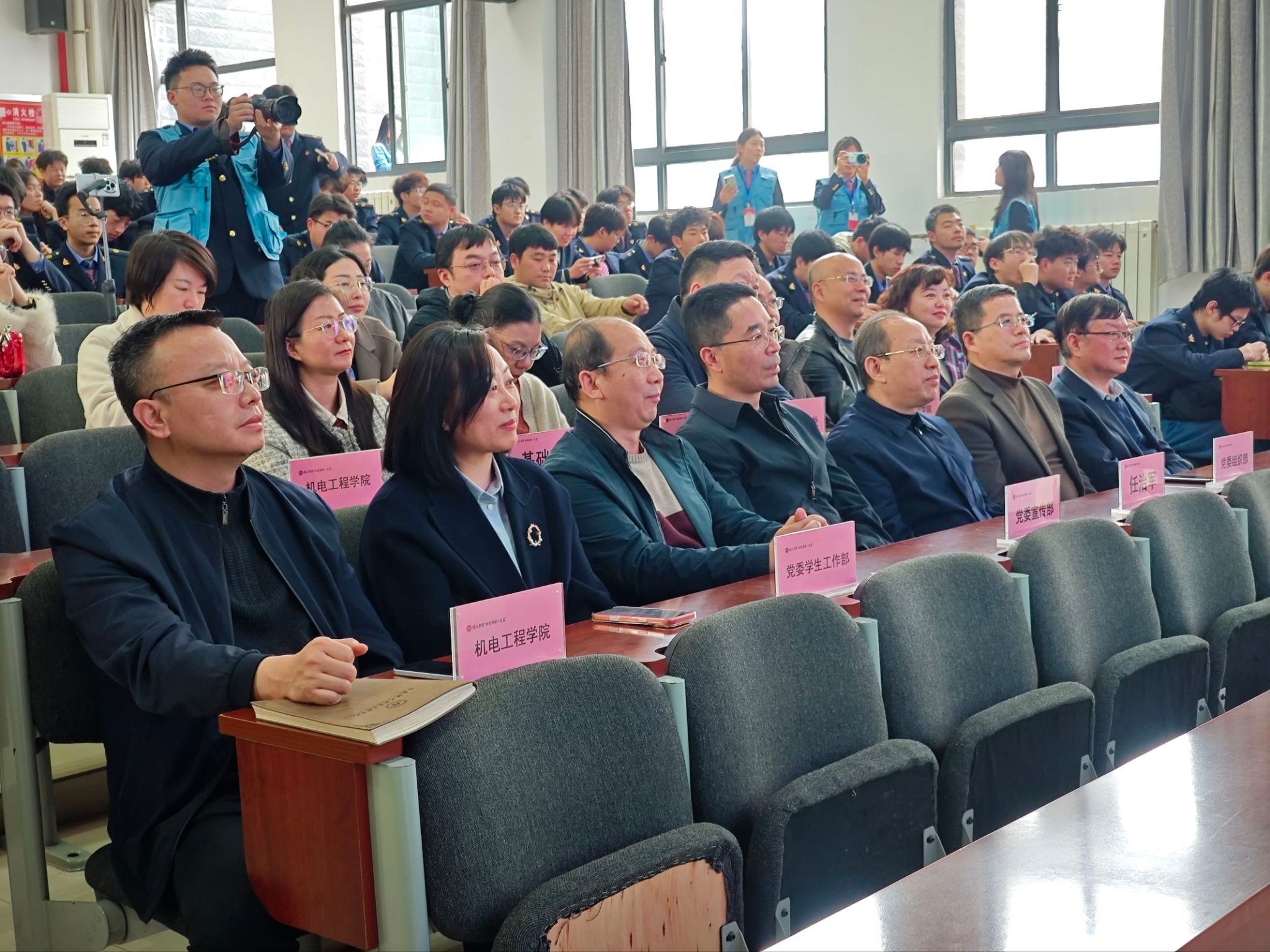 学院党委副书记任治军出席仪式。党委宣传部王琛,党委学生工作部李栋、马荣,以及与机电工程学院“四进两联一交友”结对共建的党委组织部张伟敏,教务处丁洪芬,科研处靳丽君、史骏,国有资产管理处孟永辉,安全保卫处李勇,基础部王婷等应邀参加。机电工程学院党总支书记宋永兴、院长郭峰、党总支副书记韩臻、学工办主任谷茂庆及全体辅导员、班主任、学生200余人参加活动。