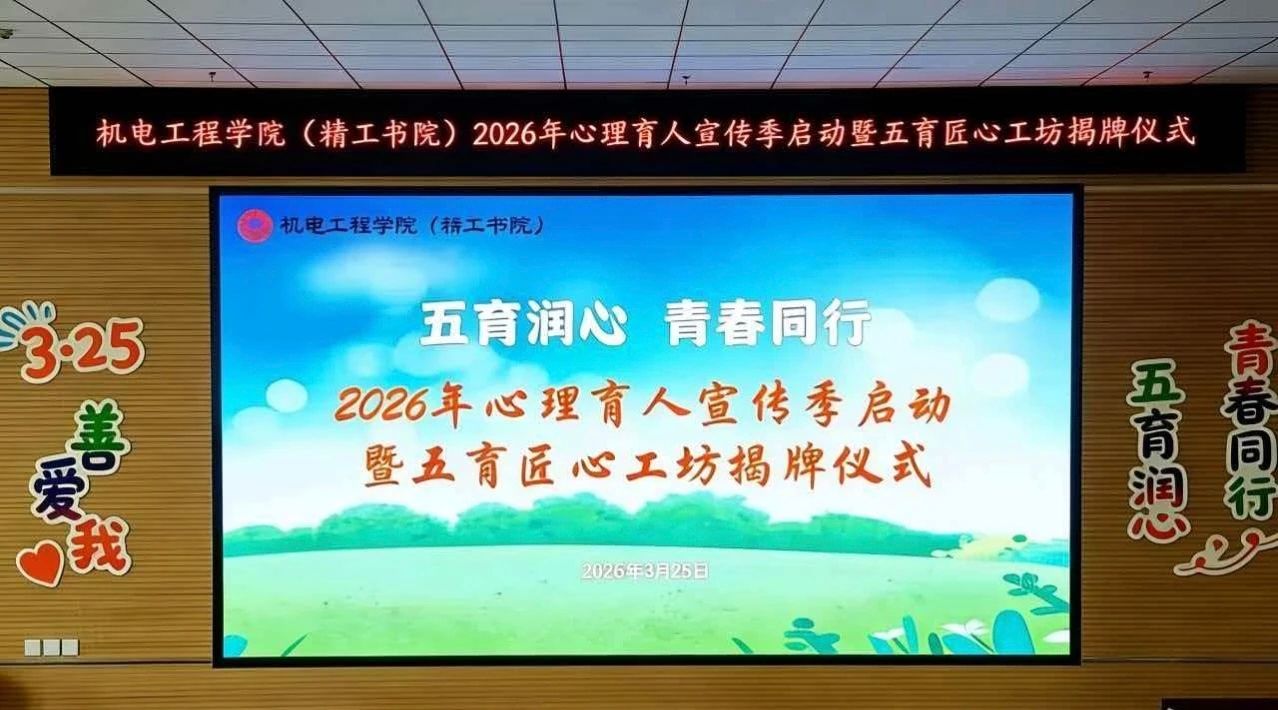 为深入落实立德树人根本任务,推动心理健康教育与“一站式”学生社区建设深度融合,护航学生健康成长,3月25日下午,机电工程学院(精工书院)2026年心理育人宣传季启动暨五育匠心工坊揭牌仪式在学院一楼报告厅隆重举行。